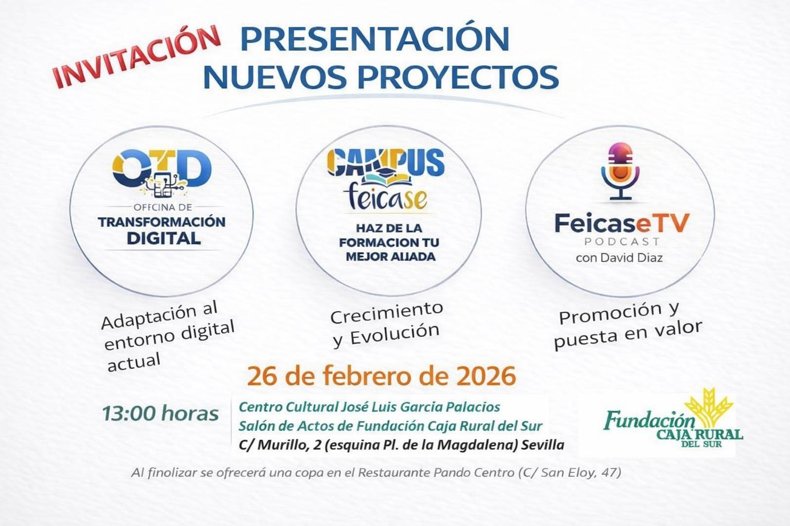 La organización empresarial sevillana Feicase presenta tres nuevas inicativas orientadas a impulsar la competitividad, visibilidad y transformación de sus asociados. Ofrece acudir a empresas del sector comercial en general, y en particular de la alimentación, droguería y perfumería de Sevilla.